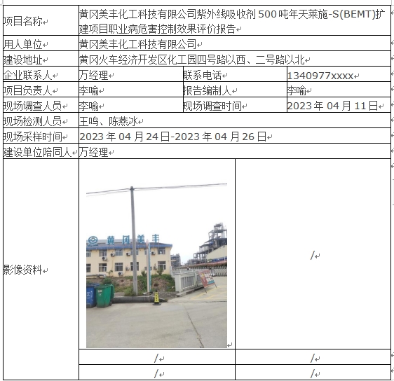 黄冈美丰化工科技有限公司紫外线吸收剂500吨年天莱施-S(BEMT)扩建项目