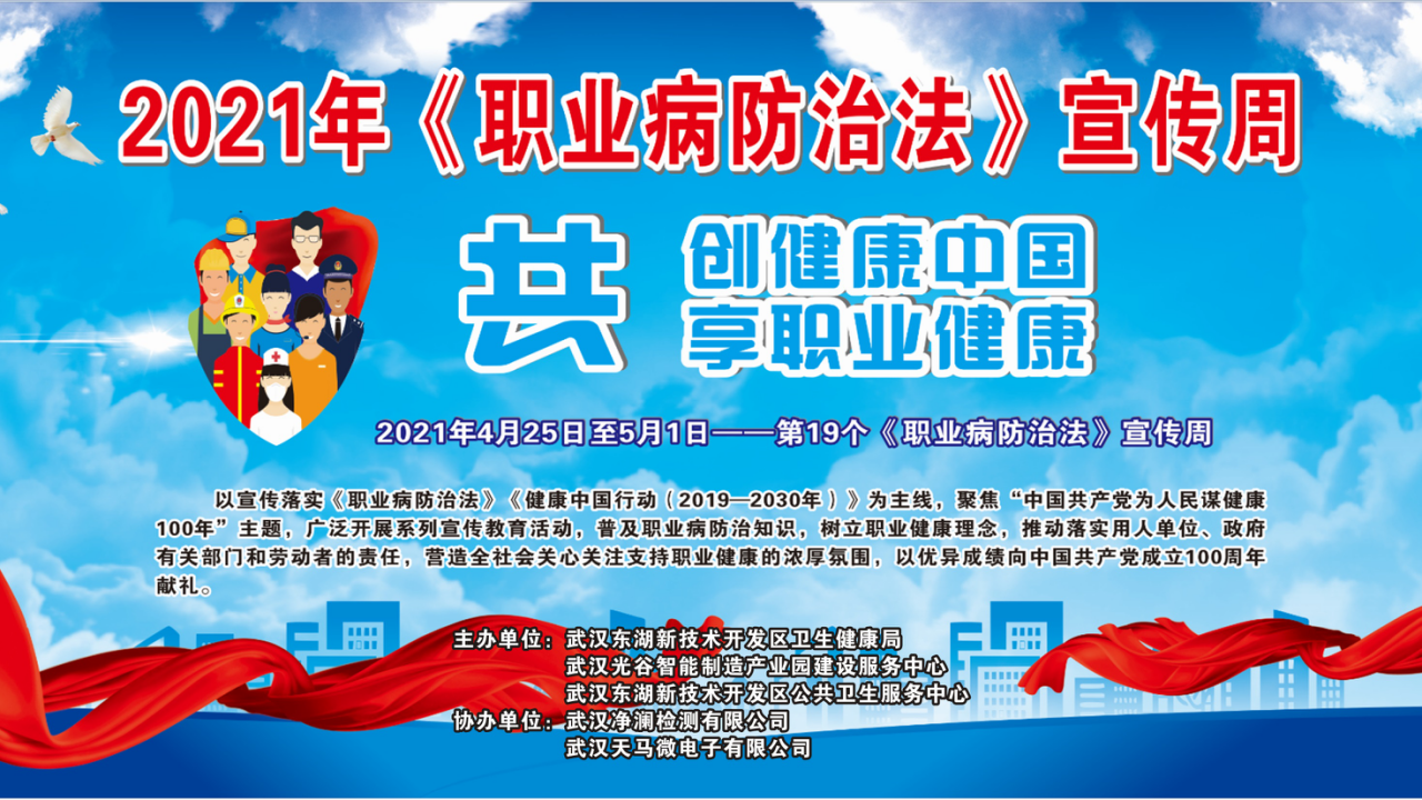 本次活动由武汉东湖技术开发区卫生健康局、武汉光谷智能制造产业园建设服务中心、武汉东湖新技术开发区公共卫生服务中心主办,由武汉净澜检测有限公司、武汉天马微电子有限公司协办;武汉东湖新技术开发区卫健局采取多种途径、多种方式开展宣传活动,同时普及职业健康知识,营造全社会关心关注支持职业病防治的浓厚氛围,以优异成绩向中国共产党成立 100 周年献礼。